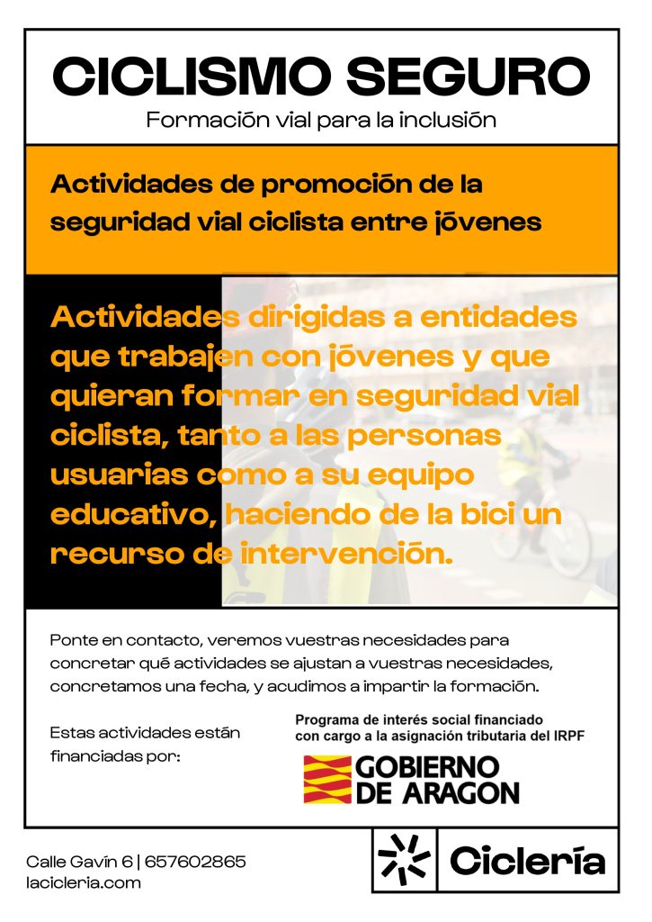 El proyecto Ciclismo seguro. Formación vial para la inclusión, financiado por el programa de interés social financiado con cargo a la asignación tributaria del IRPF del Gobierno de Aragón ofrece a entidades sociales un análisis de sus necesidades para ofrecer formación a jóvenes, equipos educativos o ambos con el objetivo de mejorar la seguridad vial e incorporar la bicicleta como un recurso para la intervención social en población en riesgo de exclusión social.